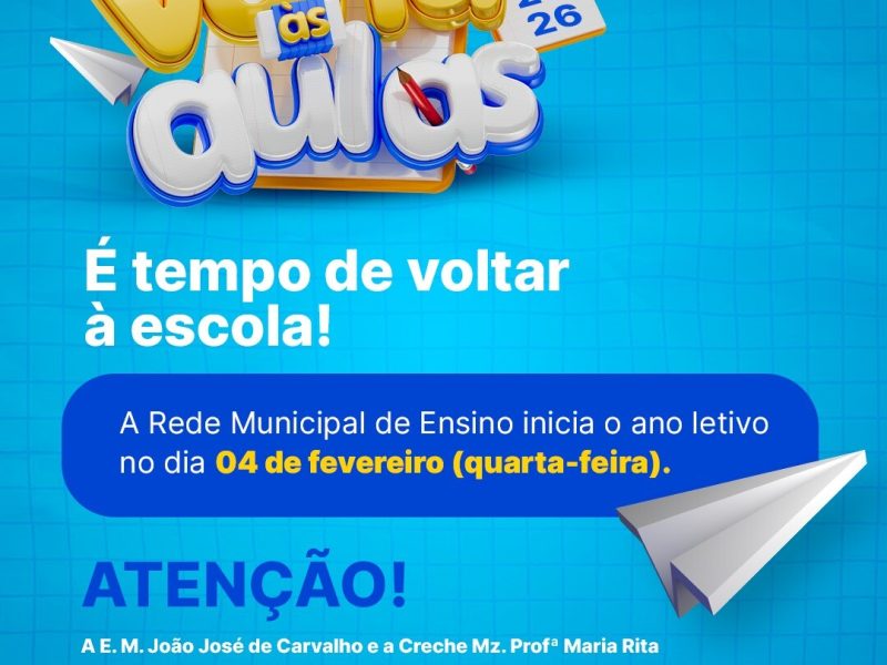 O retorno ocorre de forma regular em todas as unidades escolares, com exceção da Escola Municipal João José de Carvalho e da Creche Profª Maria Rita, que permanecem temporariamente sem atividades em razão de obras de adequação predial. Nessas duas unidades, as aulas terão início no dia 23 de fevereiro, após o período de Carnaval.