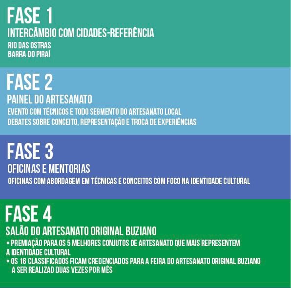 Na Fase 3, que serão concretizadas em curto, médio e longo prazo, os participantes terão acesso a oficinas e mentorias práticas, com abordagens voltadas para técnicas e conceitos com foco na identidade cultural buziana. Encerrando o evento, a Fase 4 – Salão do Artesanato Original Buziano apresentará os trabalhos produzidos, com uma premiação para os cinco melhores conjuntos de peças que mais representem a identidade cultural da cidade.
