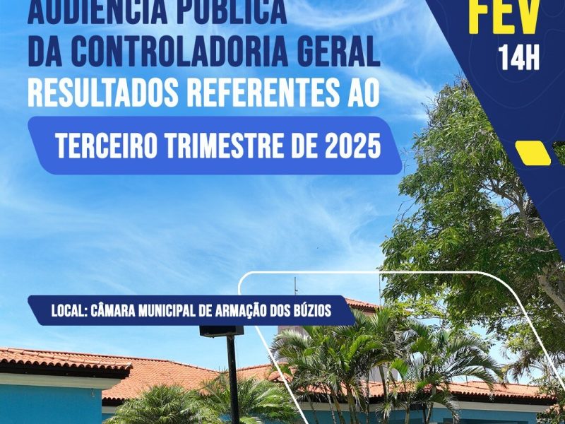 A Prefeitura de Armação dos Búzios, por meio da Controladoria Geral do Município realizará, no próximo dia 27 de fevereiro, às 14h, uma Audiência Pública para apresentar os resultados referentes ao 3º Quadrimestre de 2025. O encontro acontecerá na sede da Câmara Municipal de Armação dos Búzios e será aberto à participação da população.