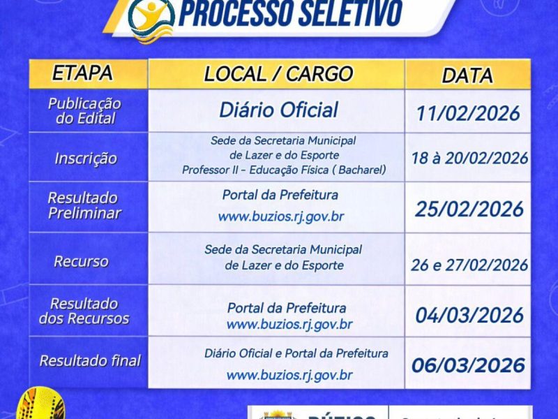 A Prefeitura de Búzios, por meio da Secretaria de Lazer e do Esporte, abre às 9h do dia 19 de fevereiro as inscrições para o processo seletivo destinado ao cargo de Professor II – Educação Física (Bacharel), com vagas para preenchimento imediato e formação de cadastro reserva para o ano de 2026. O prazo se encerra no dia 20 de fevereiro.