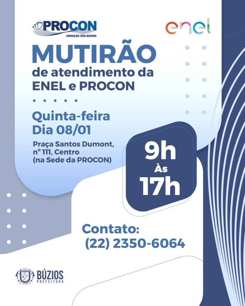 Como encaminhamento, a Enel anunciou a realização de um mutirão de atendimento aos consumidores na quinta-feira (08), das 9h às 17h, na sede do Procon Búzios, localizada na Praça Santos Dumont, nº 111, Centro. Quando há prejuízo causado pela falta ou oscilação de energia, o consumidor pode acionar o seguro de ressarcimento por danos elétricos, que é uma obrigação da concessionária prevista pelas normas da Aneel. Esse seguro garante indenização por danos a equipamentos eletroeletrônicos e outros prejuízos comprovadamente causados pelas falhas no fornecimento de energia.