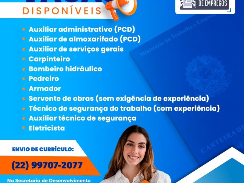 Também há vaga para auxiliar de serviços gerais, além de oportunidades na área da construção civil para os cargos de carpinteiro, bombeiro hidráulico, pedreiro e armador.