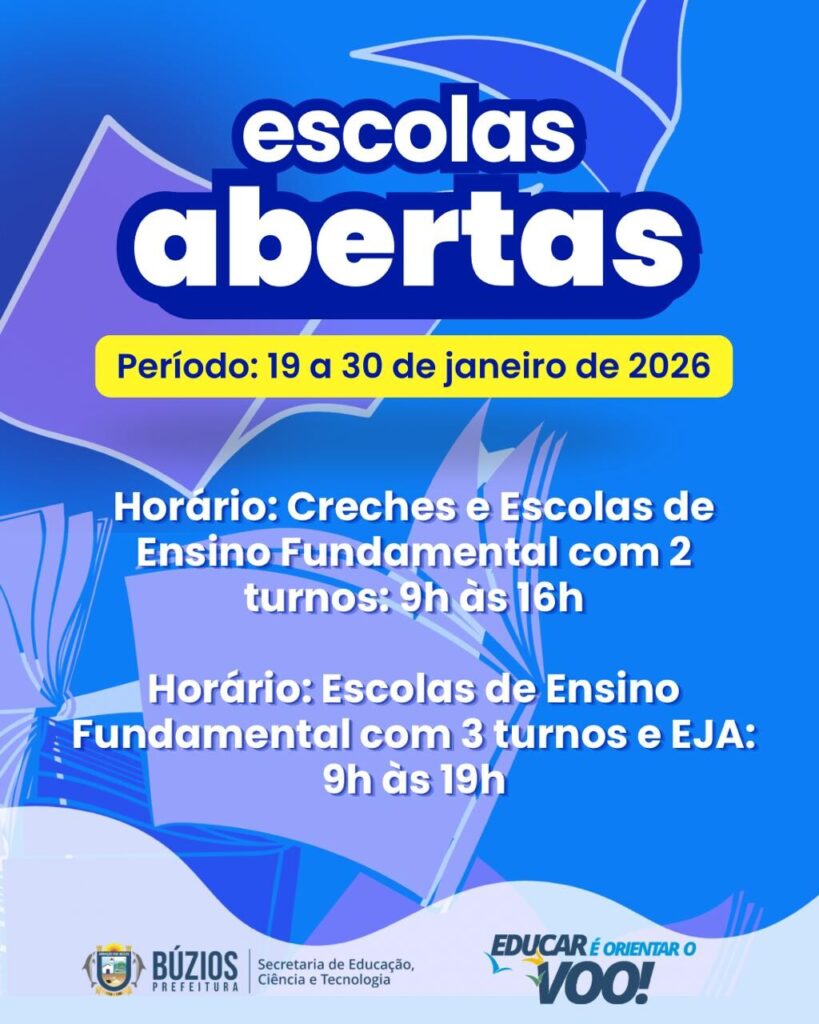 A Prefeitura de Armação dos Búzios, por meio da Secretaria de Educação, Ciência e Tecnologia, informa que as unidades da rede municipal de ensino participarão da ação “Escolas Abertas 2026”, que acontecerá no período de 19 a 30 de janeiro de 2026.