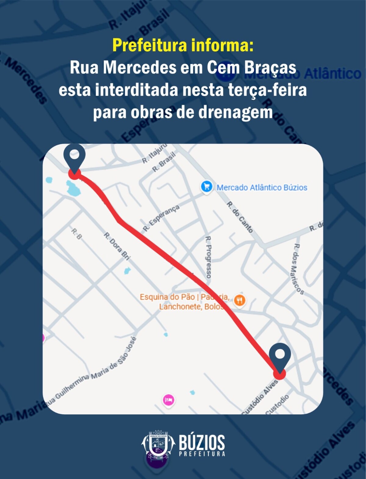 A Secretaria de Saneamento e Drenagem de Búzios informa que a Rua Mercedes, no bairro de Cem Braças, foi interditada nesta terça-feira (17), às 8h, para a realização de obras de troca da rede de drenagem.