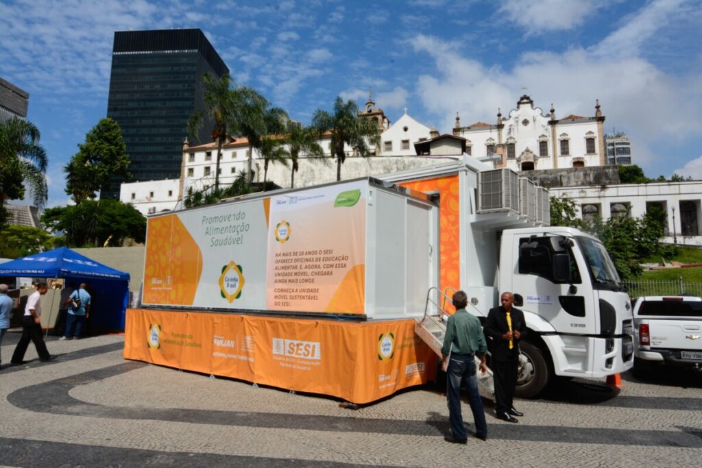 A estrutura da carreta da Firjan é adaptada, com cozinha equipada para a realização das oficinas.