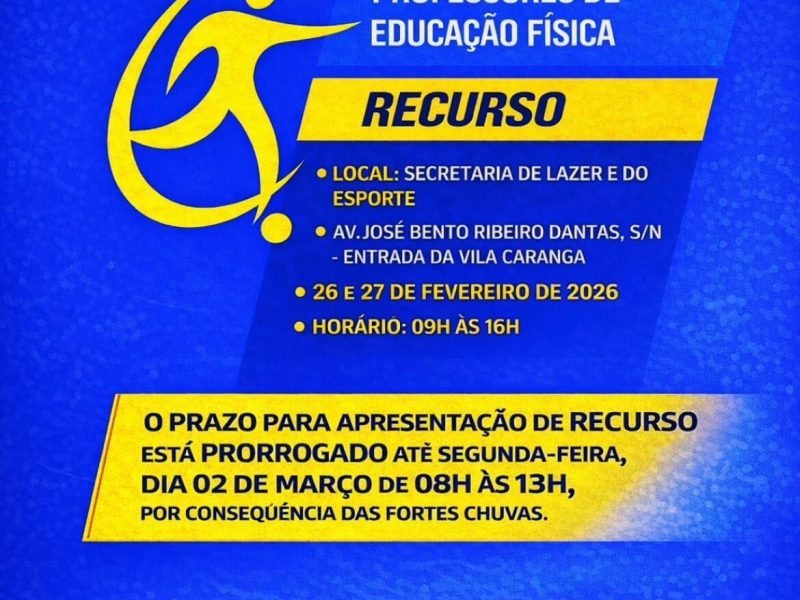 A Secretaria de Lazer e do Esporte de Armação dos Búzios informa que o prazo para apresentação de recurso do Processo Seletivo Público Simplificado, do Edital nº 01/2026, desta sexta-feira (27), foi prorrogado para segunda-feira (02), das 8h às 13h. A medida foi adotada em razão das fortes chuvas registradas no município nos últimos dias, que impactaram a mobilidade e o atendimento ao público.
