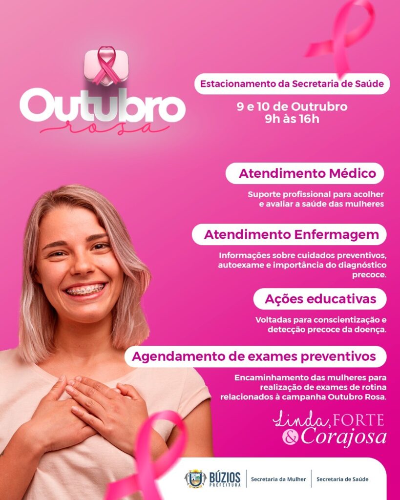 A Prefeitura de Búzios, por meio das Secretarias da Mulher e de Saúde, promove nos dias 9 e 10 de outubro, das 9h às 16h, mais uma ação especial em alusão ao Outubro Rosa. O evento será realizado no estacionamento da Secretaria de Saúde (ao lado da Prefeitura) e tem como objetivo conscientizar a população sobre a importância da prevenção e do diagnóstico precoce do câncer de mama.